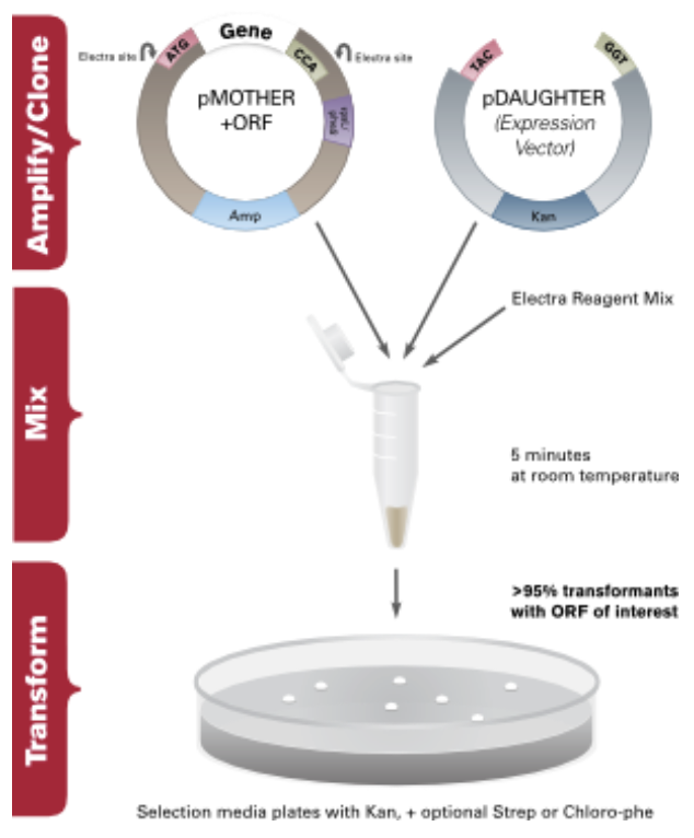 - Universal – any ORF cloned into any Electra vector. Quickly move ORFs from MOTHER vector to multiple DAUGHTER vectors