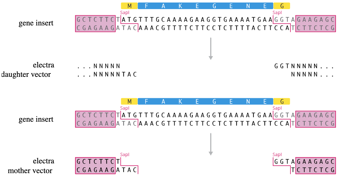 The Electra system uses the type IIS restriction enzyme SapI. SapI recognizes a 7bp non-palindromic recognition sequence and cuts outside of the recognition sequence, leaving a 3bp 5′ overhang after digestion. ORFs in a pMOTHER vector can be excised with SapI, resulting in ATG and GGT overhangs. Alternatively, PCR can be used to generate ORFs with the correct overhangs. These ORFs can then be easily cloned into pDAUGHTER vectors, which are provided linearized with the corresponding overhangs.