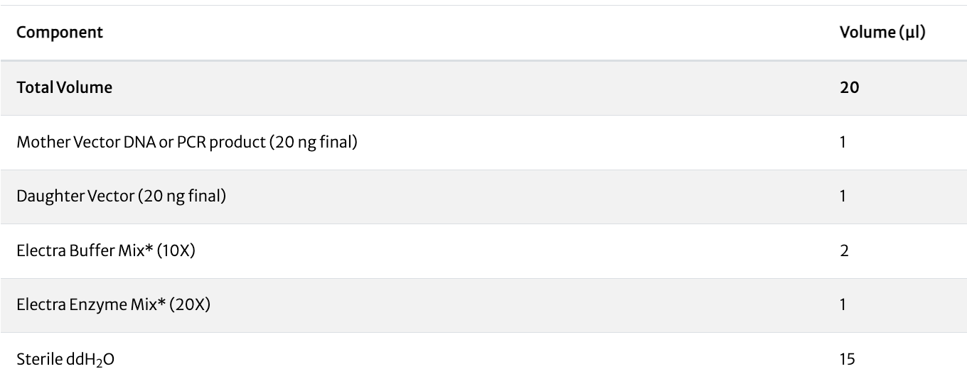 The Electra Reagents Kit contains all necessary components to facilitate cloning a gene from a pMOTHER vector or a PCR product into an Electra pMOTHER or pDAUGHTER expression vector.